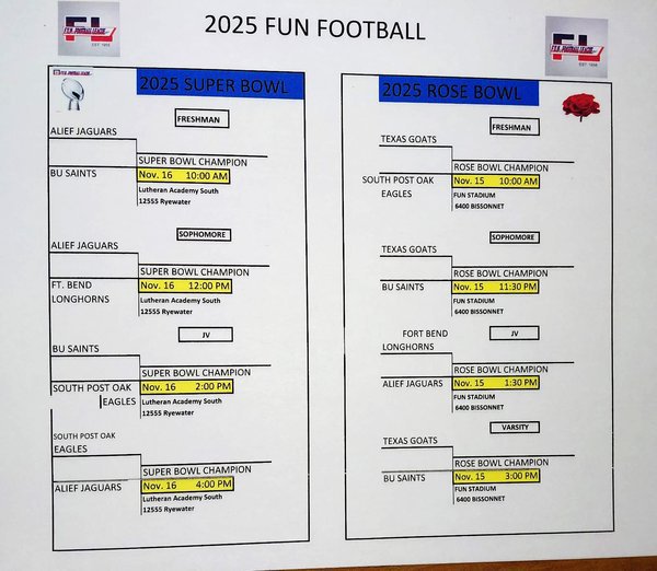 FUN FOOTBALL 2025 INVITATIONAL TOURNAMENT SCHEDULED FOR DECEMBER 12, 13 AND 14TH. ANY OUTSIDE TEAM IS CAN ENTER BY CLICKING ON RING BELOW!!!